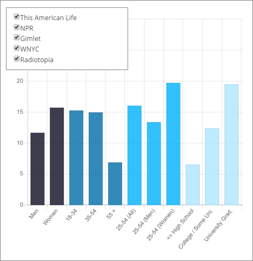 With this selection of American podcast publishers stemming from the public radio world, we get a pretty good idea of the types of listeners we’re going to be reaching; listeners are going to be well-educated, skew slightly female, and fall mostly in the 18-54 age range. It’s enough to give us some confidence that we’re looking in the right area if that’s who we want to reach.